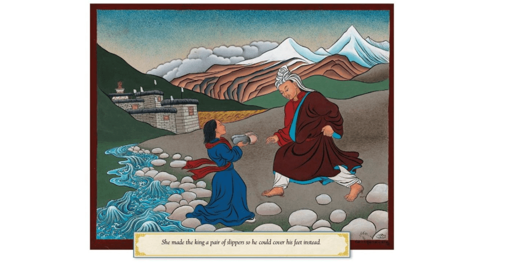 Can you imagine that? So much work, and no flowers would be able to grow! Luckily, the little girl was very wise and kind. She made the king a pair of slippers so he could cover his feet instead. From that day on, he was able to help everyone without hurting his feet.1